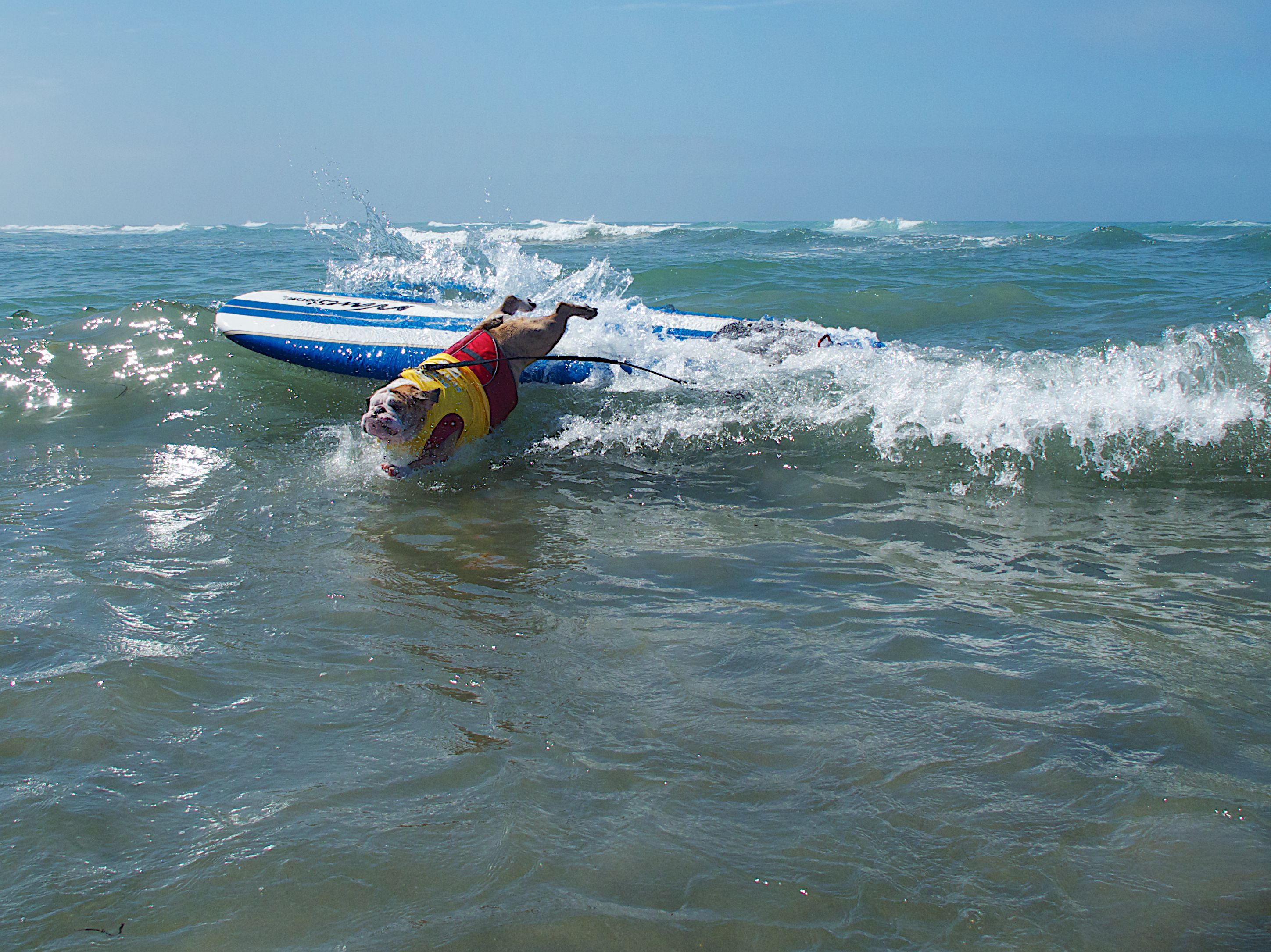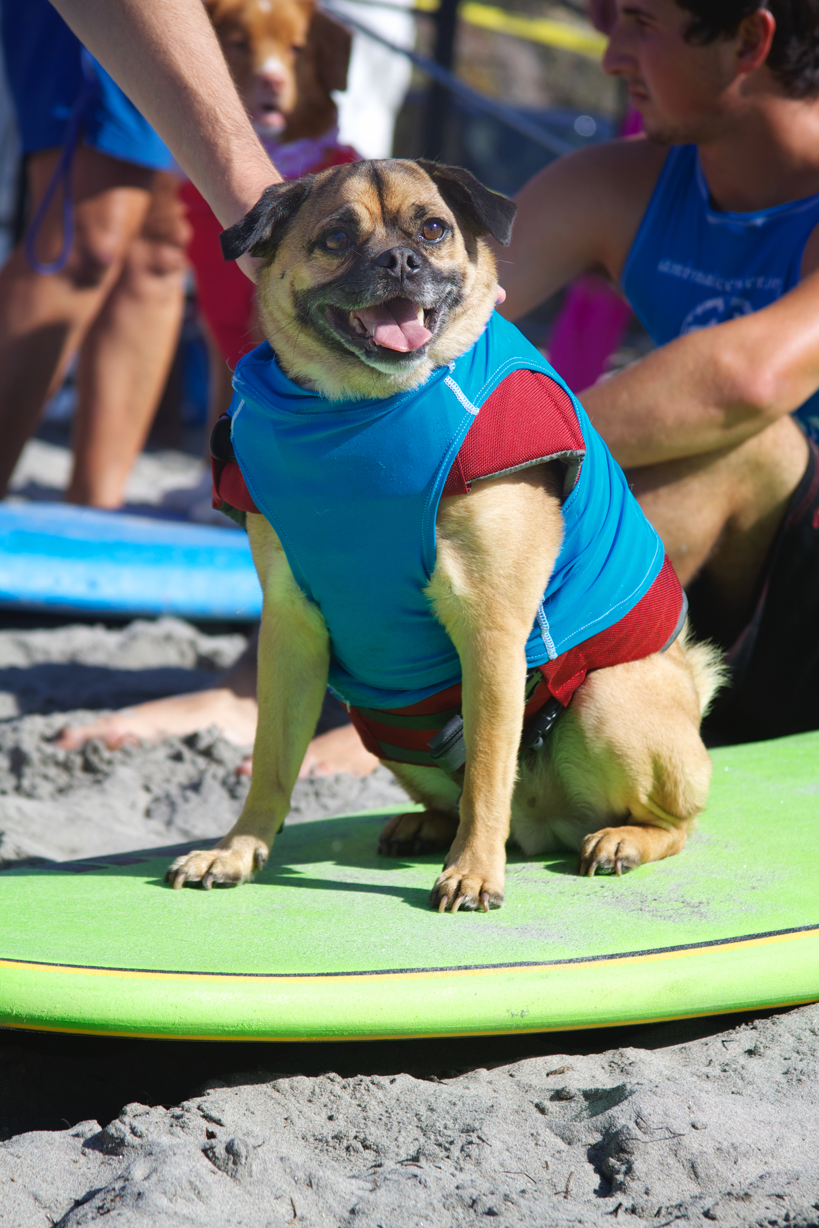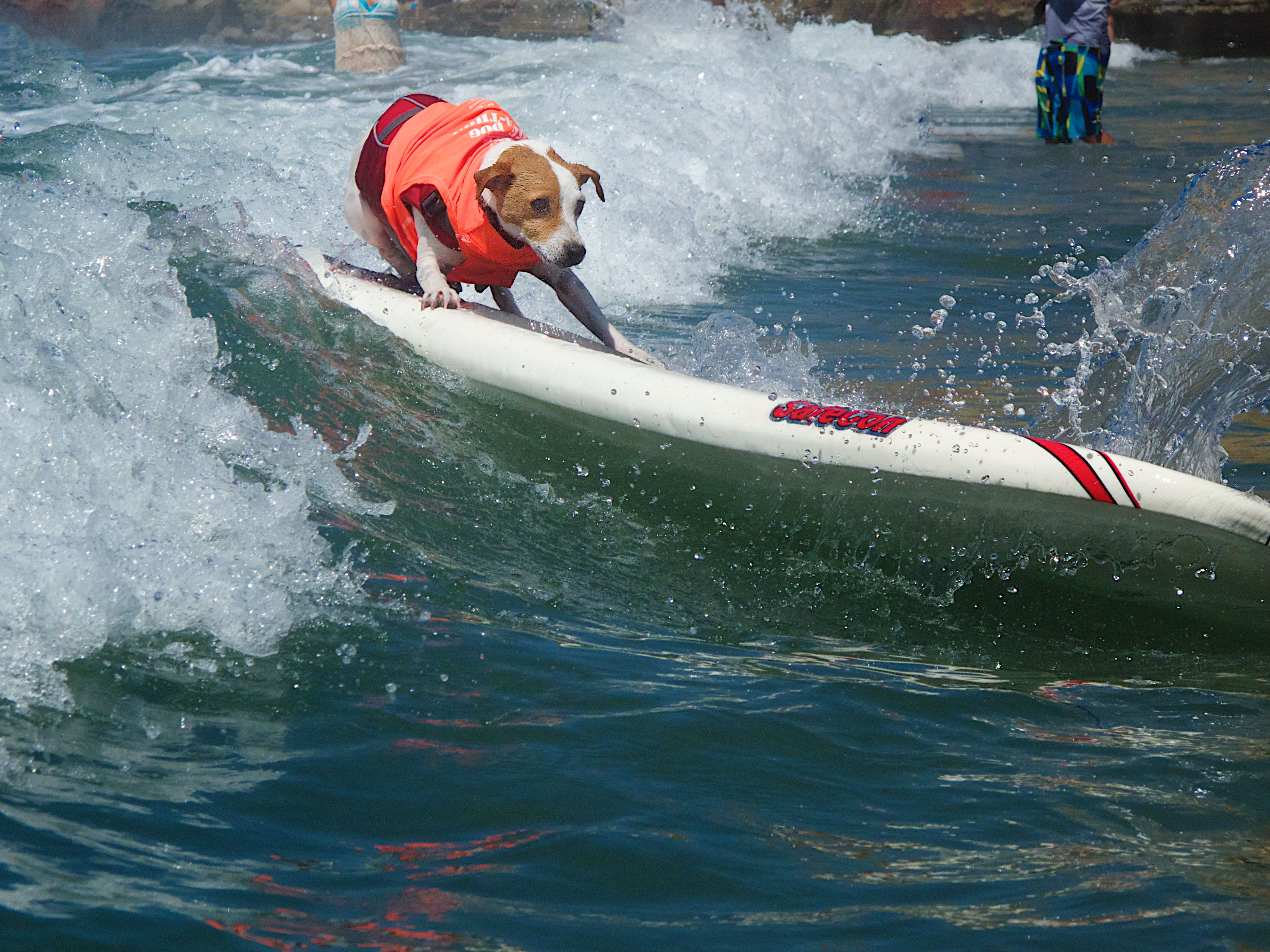 Del Mar dog beach once again set the stage for the Helen Woodward Surf-a-thon, a fund-raiser for the animal clinic. The competitors all have support teams and draw a huge crowd of spectators, 2 and 4 legged, to cheer them on as they take to the waves to show their skills whether they are new surfers or long time pros.